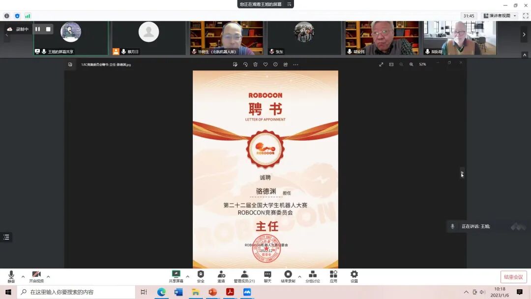 第二十二届全国大学生机器人大赛 ROBOCON竞赛委员会正式成立!发表时间:2023-01-07 11:34 全国大学生机器人大赛 ROBOCON竞赛委员会成立会议 ![]() 2023年1月6日上午10点,全国大学生机器人大赛ROBOCON竞赛委员会成立会议于线上通过腾讯会议召开。 参加本次会议的嘉宾有:大赛专家委员会主任陆际联、副主任郗安民、副主任毕树生,大赛组委会秘书处王旭、竞赛部部长蔡月日,ROBOCON竞赛委员会主任骆德渊、副主任丛德宏、副主任李明颖、副主任谢远龙,以及各位竞赛委员会委员和相关工作人员。ROBOCON竞赛委员会通过凝聚各省参赛高校和专家力量,引领全国大学生机器人大赛ROBOCON赛事高质量发展,不断扩大赛事社会影响力,培养具有探索精神、创新思维的科技人才。 集思广益,办好比赛 会议上,陆际联首先向大家介绍 ROBOCON竞赛委员会成立目的——“集思广益,办好比赛”,并对其进行解读。来自全国各省的委员会成员应各抒己见、畅所欲言,为培养优秀的科技人才建言献策。工程教育承担着培养工程人才的使命,通过ROBOCON赛事培养有工程经验的教师,为学生提供工程实践的平台。 ![]() ![]() 宣读细则,成立委员会 其后,蔡月日宣读了ROBOCON竞赛委员会工作细则。工作细则将完善ROBOCON赛事管理机制,促进赛事公平、有序、健康发展作为总则,并明确了竞赛委员会的职责和主要工作。 “我们全国大学生机器人大赛ROBOCON竞赛委员会,从今天开始,正式成立!” 陆际联教授话音落下,宣告全国大学生机器人大赛ROBOCON竞赛委员会成立。 一纸一聘书,一步一脚印 同时,在陆际联教授、郗安民教授、 毕树生教授的共同见证下,王旭宣读颁发ROBOCON竞赛委员会委员聘书。 电子科技大学骆德渊老师担任第二十二届全国大学生机器人大赛ROBOCON竞赛委员会主任,东北大学丛德宏老师、大连工业大学李明颖老师、华中科技大学谢远龙老师担任第二十二届全国大学生机器人大赛ROBOCON竞赛委员会副主任,山东科技大学崔宝春老师、厦门大学胡天林老师、西安交通大学李党超老师、电子科技大学孙锐老师、哈尔滨工业大学(深圳)熊小刚老师、广东工业大学阎秋生老师、华南理工大学张东老师、青岛理工大学官源林老师、新疆大学石飞老师、南昌大学刘国平老师、北京邮电大学李端玲老师担任第二十二届全国大学生机器人大赛ROBOCON竞赛委员会委员。 ![]() ![]() 交流探讨,共促发展 随后,骆德渊教授在发言中围绕如何扩大赛事规模影响力方面对竞赛委员会今后的工作设想发表了自己的见解,提出了两个工作重点,一、将ROBOCON机器人大赛校赛、省赛、全国大赛紧密联系起来;二、加强各赛队间的交流合作,内容更丰富、形式更多样、角度更新颖、引导更深入。 最后,在骆德渊教授的主持下,其他委员会成员就如何提高规则的制定、修改、答疑效率,保障赛事公平公正,加强各参赛学校技术经验交流互助,提升省赛比赛质量,推动赛事成果转化,进一步扩大赛事社会影响力等方面进行交流和探讨。 ![]() ![]() ![]() ![]() 回首过去,我们经历过辉煌,也曾跌落到谷底,一路上硕果累累;立足当下,我们真抓实干、广开言路;放眼未来,面对新的挑战新的机遇,我们一往无前。本次会议上大家聆听真知灼见,分享智慧火花,全国大学生机器人大赛ROBOCON竞赛委员会的成立为大赛增添了更多助力,让我们共同期待2023年全国机器人大赛给大家带来更多的精彩! ![]() ![]() ![]() 策划丨全国大学生机器人大赛组委会 编辑丨小西瓜 审核丨李辉Cynthia 战略合作伙伴 ![]() ![]() ![]() 竞赛委员会,成立! |