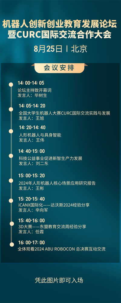 机器人创新创业教育发展论坛暨CURC国际交流合作大会即将开幕发表时间:2024-08-20 16:04 ![]() 本次论坛将围绕国内的留学生机器人教育及国内外青年科技文化交流相关话题进行座谈,分享成熟经验,解决痛点问题,并向外界传达全国大学生机器人大赛(ROBOCON ROBOTAC ROBOMASTER)社会价值,提升赛事影响力。 我们诚挚邀请各位老师、同学莅临本次论坛,共同参与讨论。 论坛时间: 2024年8月25日(周日) 14:00-17:00 论坛地点: 北京亦创国际会展中心C馆二层AB会议室 论坛主题: 探讨国内外关于机器人领域的产学研实践项目,促进国际交流,搭建全球机器人教育合作网络。 论坛安排: ![]() 主办单位 北京科技大学 支持单位 中国教育电视台 山东广播电视台 承办单位 全国大学生机器人大赛组委会 北京深蓝智能机器人研究院 深圳大疆创新科技有限公司 北京立德共创智能机器人科技有限公司 ![]() 策划丨全国大学生机器人大赛 编辑丨叮当百事通 审核丨 战略合作伙伴 ![]() ![]() 一次比赛,一生热爱! |